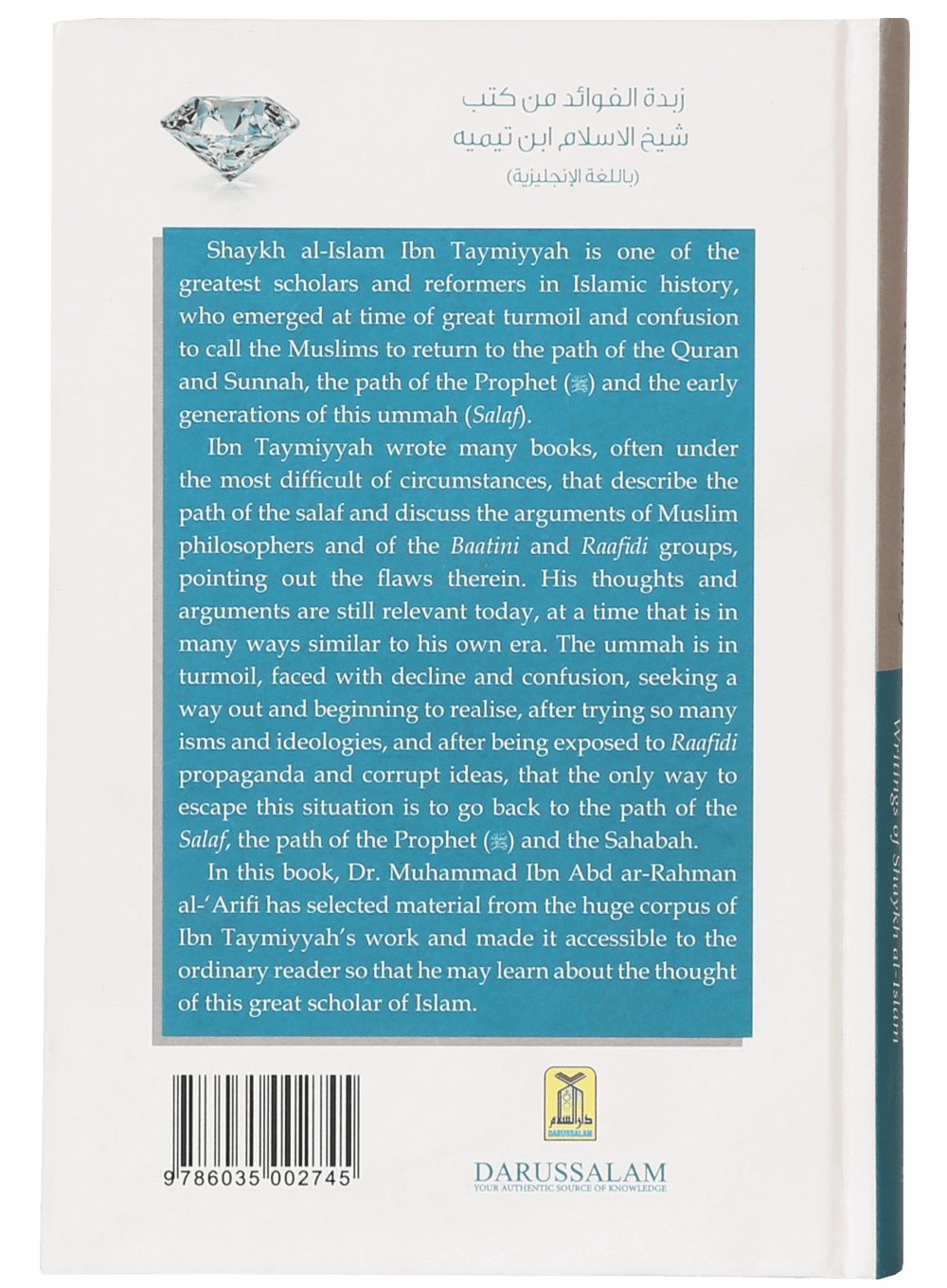 In this book, Dr. Muhammad Ibn Abd ar-Rahman al- ‘Arifi has selected material from the huge corpus of Ibn Taymiyyah’s work and made it accessible to the ordinary reader sso that he may learn about the thought pf this great scholar of Islam.