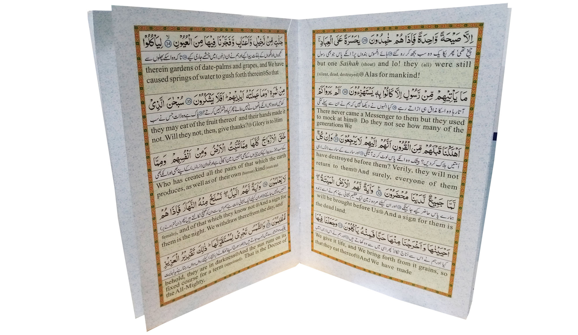 Surah Yaseen with English & Urdu translation is a light and easy to carry booklet. It features Surah Yaseen in three languages i.e. Arabic, Urdu and English. The Arabic text has been translated into Urdu and English language by certified and learned scholars in order to help all non-Arabic speaking Muslims in understanding the meaning of this beautiful chapter of the Holy Quran.
